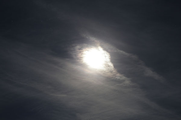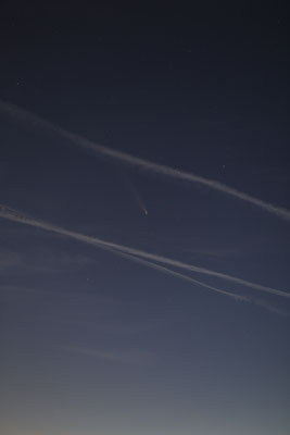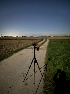 Der wohl erfolgreichste Tag meiner Kometen-Beobachtung! Die dünnen Wolkenfetzten stören den Blick auf Tsuchinschan-ATLAS kaum. Leider erhellt heute ein besonders erdnaher "Super-Vollmond" den Nachthimmel und sorgt damit für einen hellen Nachthimmel. Somit ist der schöne Schweif des Kometen nur schwach zu sehen. Nichts desto trotz konnte ich heute ausreichend Fotos für eine schöne Zeitraffer-Studie des Kometen sammeln (siehe unterhalb). Wer genau hinsieht, der erkennt am Einzelbild ganz zart den Ansatz des dünnen Gegenschweifs, der in die entgegengesetzte Richtung des Hauptschweifes zeigt.