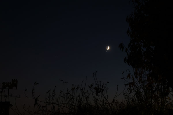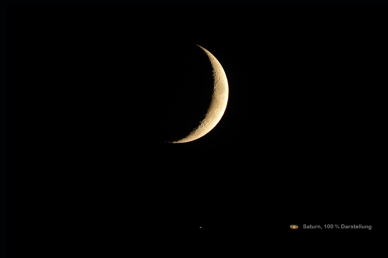Am 11.11.2018 kam es zu einer sehr nahen Begegnung der zunehmenden Mondsichel mit dem Saturn. Die Winkeldistanz der beiden Himmelskörper betrug lediglich 0,3 °, weniger als ein Monddurchmesser. Sie passten somit gemeinsam auf das Bildfeld meines 150/750 Newton. Die erst zu 16 % beleuchtete Mondsichel überstrahlte dabei den Saturn (0,6 Größe) nicht.